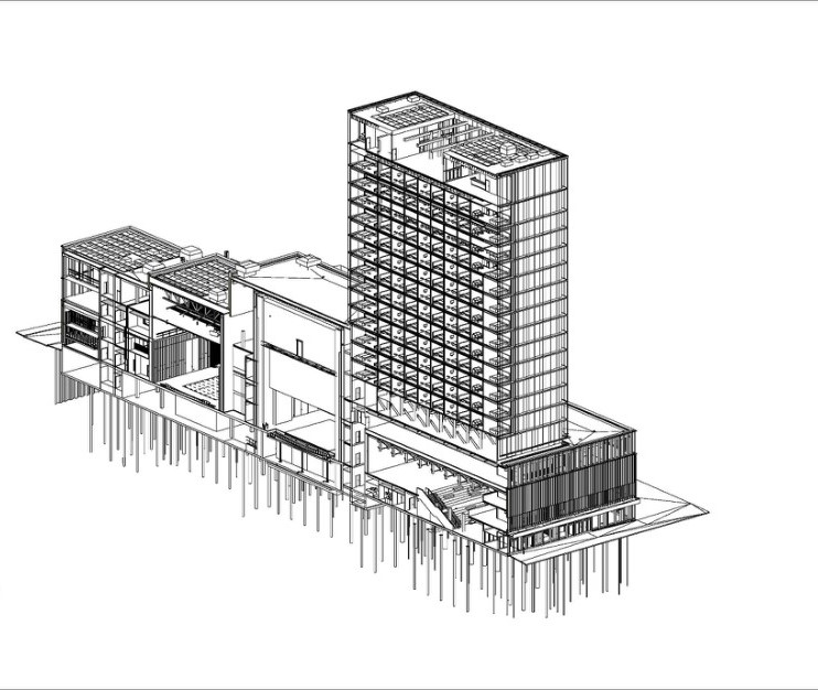 整个建筑项目的底部,是文化中心,上方的特色桁架由胶合木和钢拉杆组成,可实现灵活的开放式空间,能满足一系列活动和功能的需求,以适应未来需求来保证建筑的长期可持续性。
